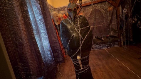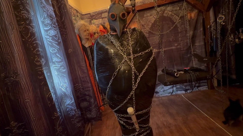 Being secured to the post with chain and pallet wrap. With a nice treat of a wand secured on his cock, for some lovely orgasms. all to keep me a mused while I edit more content!