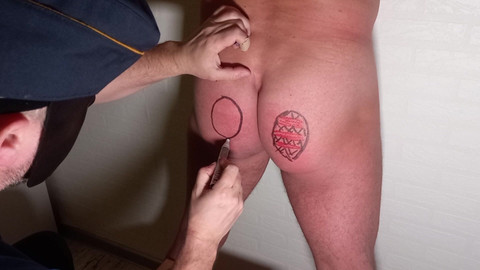 Another Real-life episode no.3. I slightly adapted a tradition of art on eggs during Easter. I body-painted on my locked slave's body, balls, and butt. I used permanent markers and a cane. Happy Easter