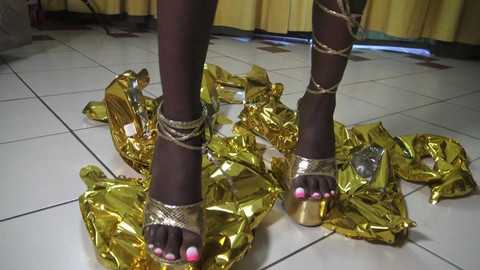 Ebony Balloon Heel Crushing! Black Pearl Keysha crush golden balloons with her golden mega high heels