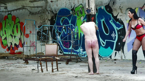 The slave gets the whip so hard on his naked body from the mistress until he has really nice welts and marks from the mistress