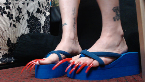 The longest nails I have ever had on my toes, Ever! Painted red, cascading over the edge of my thick wedge blue flip flops. Long enough to reach the floor. I lift them spread my toes and wiggle jiggle them. Standing and sitting showing different angles of toe wiggling and pressure on my long sexy red toenails. At the very end, I rip them all off.