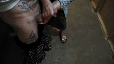 A girl jerks off my cock in the entrance.