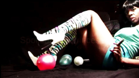 Here you have a wonderful combination of giantess dress watching while watching Goddess Simone bust your balls with her sharp and tall skyscraper fetish pumps by popping colorful balloons with them. Sexy knee-high socks to go with my bratty theme and then the final best part is saved for you foot freaks. You are pushed to sniff my sweaty stinky pungent odor feet as I slowly take them out of my high heels and bring them up close to the camera. Look straight through my socks and see how I spread my beautiful toes in them. Finally, I take a sock off after you got my full foot scent up your nose and watch me slide baby oil on my ebony soles!