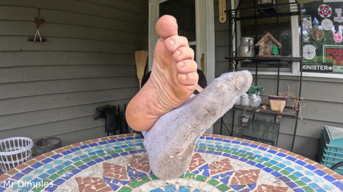 I head outside and show off my feet on porch. First I show off my dirty socks before I take them off and start sniffing them while wiggling toes. I was wearing boots earlier so they have a vinegar smell. Smelled really good!