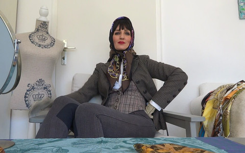 Today I am wearing a tweed outfit. A jacket and underneath a vest with a blouse. Riding breeches and, of course, a silk scarf worn around the neck as an ascot cravat. I try on different silk scarves tied as a headscarf. The Ascot Cravat is then worn as a headscarf and then I try on other scarves as headscarves. I sometimes wear gloves for this. There are so many possibilities. Which style is your favorite style? One thing is for sure, autumn can come!