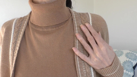 Well, you've got some nerve! You show up at my place four hours before your wedding! I was just about to change. My step-father Richard will be picking me up soon. He'll probably be here earlier than we agreed! Today I'm wearing a three-piece knit outfit. A beautiful cashmere cardigan with a turtleneck sweater underneath and knit pants. All color-coordinated. Well, you've got a big bulge in your pants again! Fine, then stare at me. Start masturbating, you don't have much time. Your step-father could be here any minute. I'll rub my soft sleeves against your face. You can sniff the cashmere and rub your face against my sweater. You can cum on my sweater! This will be our secret! Don't tell anyone! That would be quite a scandal!