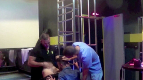 This sexy french twink is fucked by 2 scally boys in sneakers and jogging in the backroom.