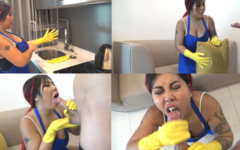 Maid service cleans youre room and sucks youre cock wearing yellow latex gloves.