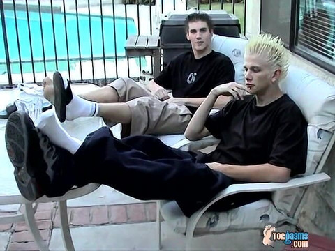 Evan and Ian are the kinds of boys who are up for all kinds of fun. We were all hanging out and somehow got into the kitchen after a little show and tell outside. The boys wash each others feet, then get messy in some food fun, licking each others feet and toes! It's amazing how much fun you can have with a couple of straight guys.