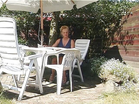 Blonde milf showing off her boobs outdoors in vintage video.