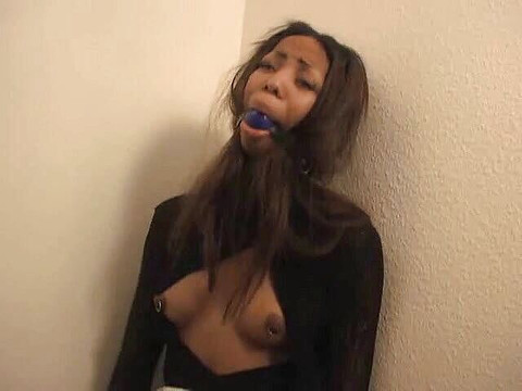 Jazmine James, ebony sweet slut in touching bondage scene with her mouth full of ball gagged.