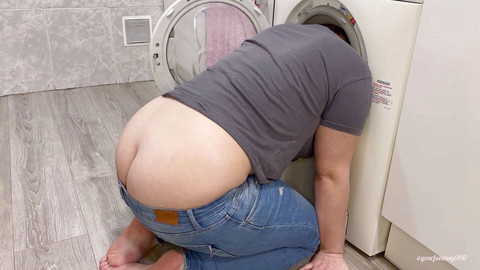 I think my washing machine is broken. I want to check it but I got stuck in it. I am in my jeans and they are a little low so my buttcrack is very visible. I have a lot of gas. I call my boyfriend but he doesn't answer. It will stink in this room. I need to get out. But nobody comes to help me and I continue to fart a lot.