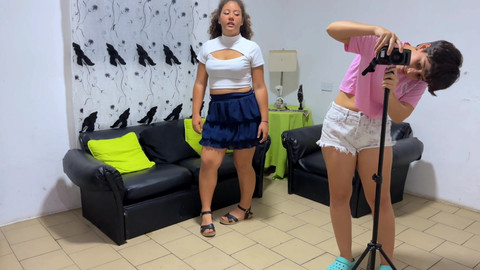 A cute Latina and her friend have their clothes magically removed as they pose for photos in front of a magical camera.