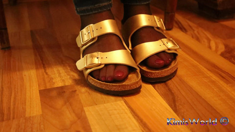 Ein ruhiger Abendmoment – Jeans, hauchdünne Nylons und goldene Birkis Das Model spielt sanft mit den Schuhen, lässt sie schaukeln und wieder auffallen – ruhig, echt und unaufgeregt. Ein minimalistischer Clip mit warmer Lichtstimmung und natürlicher Bewegung.