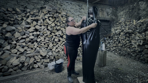 My filthy slave is trapped in my wood room, bound and stripped of all control. Arms wrenched into a shoulder restraint, hooded and locked in chastity. His pathetic cock feeds directly into his gag – a fitting punishment for his twisted perversions. But disobedience demands escalation. I force a freezing enema into him, then lock him into humiliating plastic pants to stew in his shame. This is relentless domination.