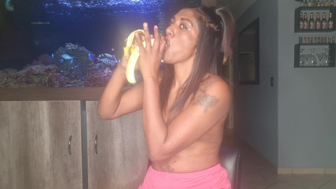 Topless tattooed small boobs desi slut sits on a rotating chair, peels a banana just to continuously suck on it as well as gagging on it as she deepthroats on it, while squeezing her small dark desi boobs, banana tit rubbing.