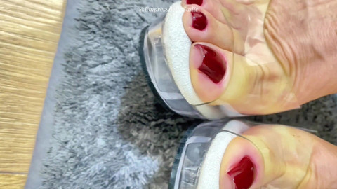 The camera glides over the long, flawless red nails before revealing mature feet carrying a magnetism that only experience can grant. Encased in transparent platform heels, every curve, every line of the skin, every detail of the sole becomes an irresistible invitation to worship. The crystal-clear acrylic amplifies the power of each movement, turning steps into silent commands. The contrast between the deep red and the seductive transparency creates a visual ritual where maturity, elegance, and dominance converge. Nothing here is accidental: it is the art of provoking, controlling, and subjugating with the sheer force of a pair of feet that know exactly the effect they have.