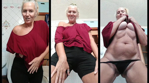 Summer is over, and the cold weather is setting in. As always, a cheerful and energetic older woman is having fun in the kitchen, warming up her sexy body with seductive movements.