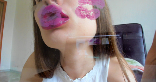 video for lovers of kisses and beautiful lips. In this video, purple lipstick is used. You can see the marks of kissing through the clear glass. these bright lips are so close to you.
