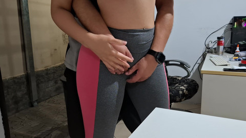 Horny girl rubs and masturbates her camel toe on the table when her neighbor arrives and helps her orgasm by masturbating her outside and inside her leggings and grabbing her nice breasts.