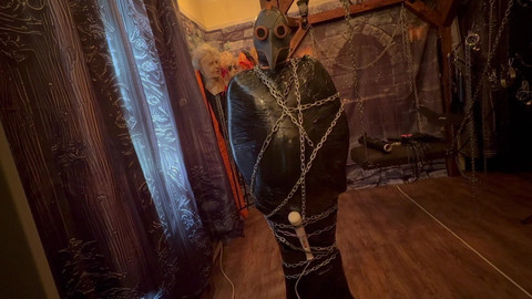 Being secured to the post with chain and pallet wrap. With a nice treat of a wand secured on his cock, for some lovely orgasms. all to keep me a mused while I edit more content!