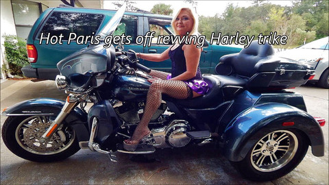 Paris gets nasty rubbing her pussy while revving up this massive Harley Davidson 3 wheeler.