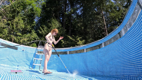 NO SOUND. I begin by taking off my bikini. I start pressure washing the swimming device, with plenty of pussy and ass views. Throughout the clip, the camera moves around and I change angles and distances. Includes poses such as standing behind, doggy style, laying / sitting on my butt, squatting, and more. I then grab the hose and begin spraying down everything and using a vac to clean up even further. At the end, I sit down in the remaining water to cool off.