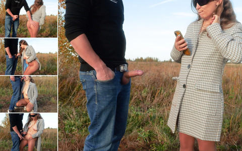 Another beautiful outdoor video. I'm walking along the path, into the field. The man is standing with his back to me. I walk past him, and he jerks off. I want to turn to him, but he turns away from me, hiding his penis in his hand. I felt so interested in touching it. Is it so hard and tasty? I'm an exhibitionist in a plaid coat and tights. Seducing a man in the field. I lift my coat from the back and stroke my nylon butt. A man jerks his penis with my hand. Unbutton your coat and you will see my body. Big breasts, belly, pantyhose, pussy... I really want to take your dick into my mouth. He fits into my mouth so beautifully. I will play with your pussy with my fingers, while my lips and tongue enjoy your penis. Get my pussy dirty with cum. I milked your sperm myself and put on the tights. They stuck to the body. Thank you for the wonderful meeting.