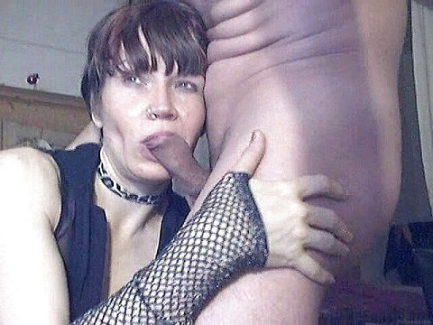 Brunette short hair girl with sexy gauntlets and transparent lingerie sucks his cock.