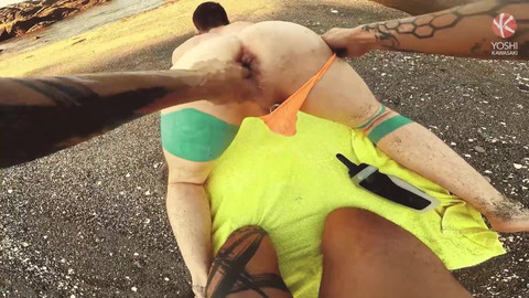 Taking a walk on a quiet beach, Yoshi finds Axel Abysse sunbathing in a very skimpy orange thong that exposes his plump lips.