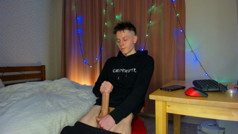 I’m an 18-year-old skinny twink with a massive young cock that barely fits in my hand. Watch this amateur twink strip totally naked. Grab that big cock and start a hot handjob. Slow strokes from the base up to the shiny head. Then faster and faster till the veins bulge and my balls slap against my thigh. My abs flex tight. My back arches. And boom-huge gay cumshot! Thick ropes of cum blast across my chest. Drip down my abs. And I milk out the last drops onto my fingers. Homemade solo from a cute gay boy who knows how to edge himself to explosion.
