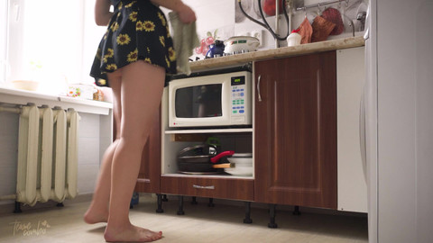 I'm just trying to cook, are you going to watch my every move? Okay, just sit in that corner and be quiet while I work on making us a nice meal. You can watch my short skirt perfectly highlight my ass cheeks and the striped panties below. Panties are a bit tight so they give a sweet rear cameltoe. Hope you don't mind to cuddle when I have finished?
