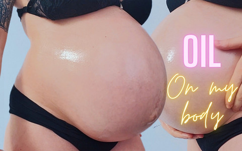 Watch me while I massage my oily body after a long shower. I'm putting a lot of coconut oil on my whole body, especially on my huge belly.