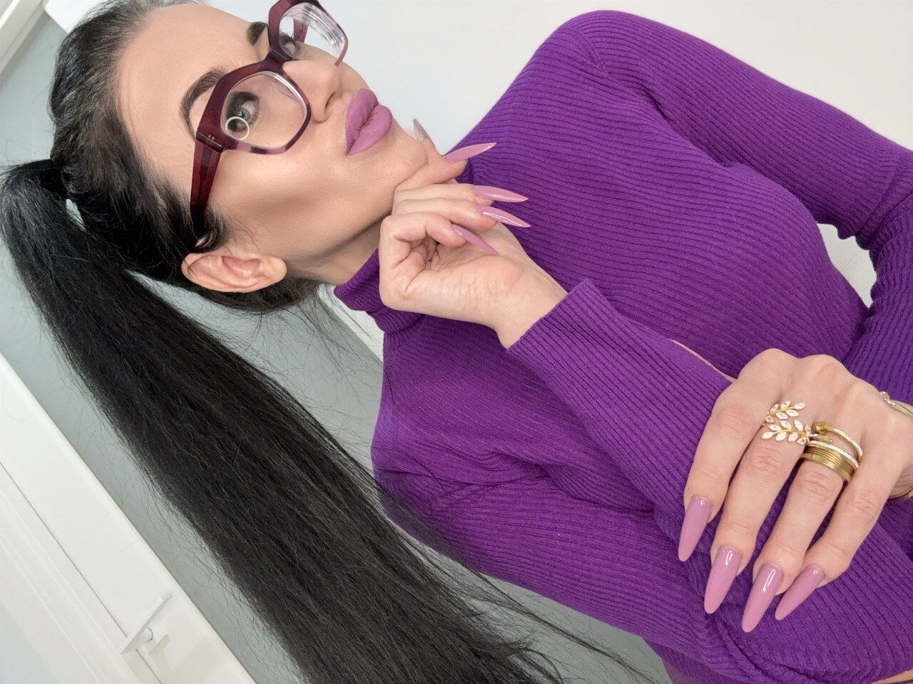 My BLACK Long nails, sharp stilettos are close ups. Im tattooed skinny milf with glasses on. Brunette and red lipstick on lips. Long hair pulled back in a ponytail. Lace red lingerie and red top on. Palms spreading very wide. Claws. Showing my long nails, playing with hair and more. HOT handjobs with spit, spitting. Nail deep in peehole too. Glamour and arrogant women, face worship. Worship my long nails and cum all over long fingers.