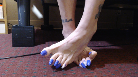 Sexy long purple toenails, closeup toe wiggling toe play. Barefoot