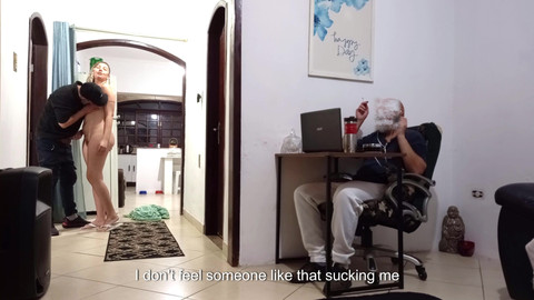 The husband was working with headphones on when his wife received the delivery man, who was only wearing a towel and let it fall. She teases him, then gives him oral sex and lets him touch her body. Then she has sex with him without a condom and rides his penis until he fills her with semen.