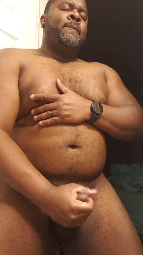 Playing with my fat belly as I stroke my big black cock BBC.