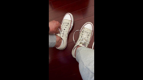 I've been wearing these same trashed smelly socks for weeks now. I've also been dropping some cum loads on them as you may be able to tell. You can almost smell as I remove my sweaty sneaks, show my trashed socks and strip to bare feet. I'm a little aroused by it all and end up stroking my hard cock.