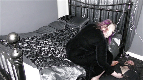 So... he's still in the body bag. But, it's time to let him out, I guess. But, not before I have a bit more fun first. I loosen the zip, but not the buckles. So I have access, but he's still trapped! Being confined so long has made his body super-sensitive! This is going to be fun. I take the zip down just far enough to expose his cock - his erection is on show, I can put a foot in his face and one on his cock - and there's nothing he can do about it! So cruel! But, the best is yet to come. After a little bit face sitting and cock-slapping I expose my secret tool... I have a new vibrator, it has a unicorn head, a horn that actually adds to the vibrations. So, I use it to edge him... over and over again... he's begging for release, but, again, will I allow it....?