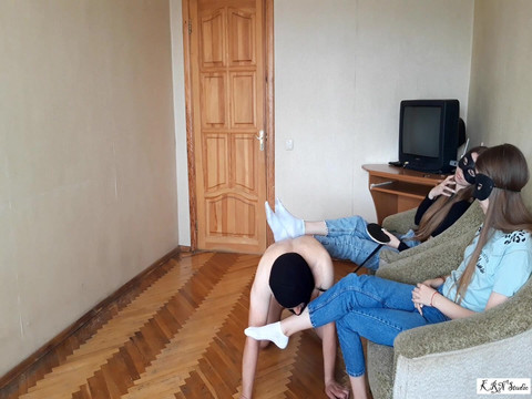 One male slave pleases 2 young mistresses. They make fun with him, make him kiss their feet and kneeling in front of them. One mistress takes his cock and pull it