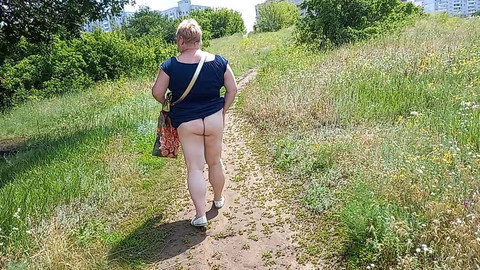 A fat woman walks through the park shows her ass and masturbates
