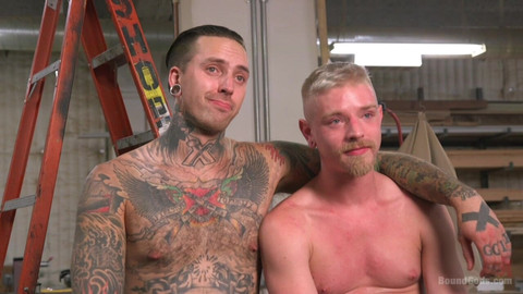 Getting a job is hard enough as an ex-convict, but luckily Ruckus was able to land a gig working in the wood shop. When his co-worker Cody keeps harassing him with questions, Ruckus decides to show him just what being a prison bitch is all about. Cody's shoved to the floor with a boot on his back as Ruckus beats his ass red. Painful clamps are placed all over Cody's chest and on his tongue to shut him up. Heavy tools are tied to his balls as Ruckus orders him to crawl over for some deepthroating. The tatted up convict lashes out with an intense flogging before locking his bitch up in a wrist and ankle stock. Cody's pale ass turns nice and red after enduring a caning before having his ass by his new master. Ruckus finally blasts a load in Cody's mouth and has him taste every drop off his raging hard cock.