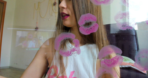 video for lovers of kisses and beautiful lips. In this video, purple lipstick is used. You can see the marks of kissing through the clear glass. these bright lips are so close to you.