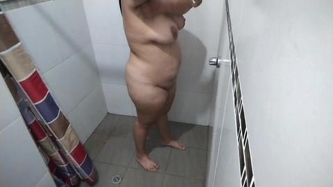 Stepmom doesn't realize that she's being filmed while she takes a shower and you see that she has big and good tits and a very nice ass and a very big pussy, she starts rubbing her body very rich while she runs the soap over her parts.