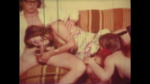 Two girls make happy a young cock that they share in this american vintage porn video