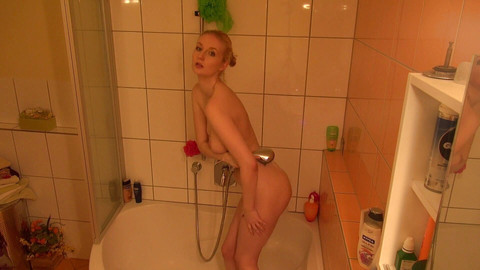 Frumoasa blondă cu țâțe mari Helena Sculptura face un duș și își freacă corpul sexy.