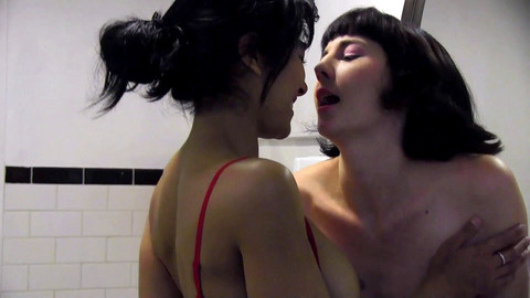 A young and sexy brunette seduced by a lesbian in a shop and dragged in the toilet for fuck.