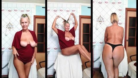 A hot housewife bares her large natural breasts in the kitchen, kneading them and twirling her nipples. She takes off her T-shirt and reveals a pair of tiny black panties, seductively captivating the men's gaze. Large white breasts hang over a thick, tanned belly. With seductive movements, she adjusts her panties, which dig into her pussy and ass. Her large, round butt jiggles seductively. Enjoying her delicious body.