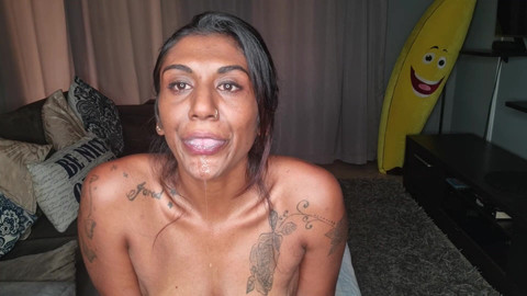 Tattooed desi slut sits on the couch displaying her dark small boobs and nipples, drooling on her boobs as she repeatedly sticks out her pink tongue as well as wiggling it around, tongue play.
