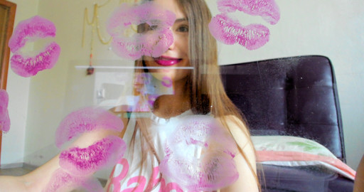 video for lovers of kisses and beautiful lips. In this video, purple lipstick is used. You can see the marks of kissing through the clear glass. these bright lips are so close to you.